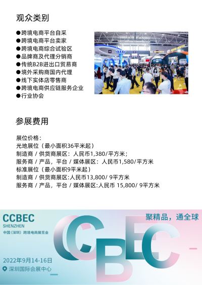 2022 中国(深圳)跨境电商展览会(CCBEC)作为国内的大型专业跨境电商展览会,将于9月14-16日在深圳国际会展中心举办。展会面积有望达到100,000平方米,预计将汇聚2,500家全品类的供货商、跨境服务商及电商平台企业,展示他们的新产品和服务。展会也提供丰富的同期活动,覆盖行业发展、政策法规、营销策略、服务配套以及投资融资五大板块,聚焦行业实际的发展需求,为参展商和买家提供而高效的商贸平台。